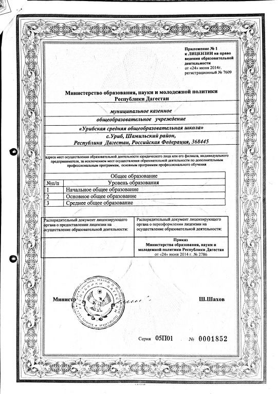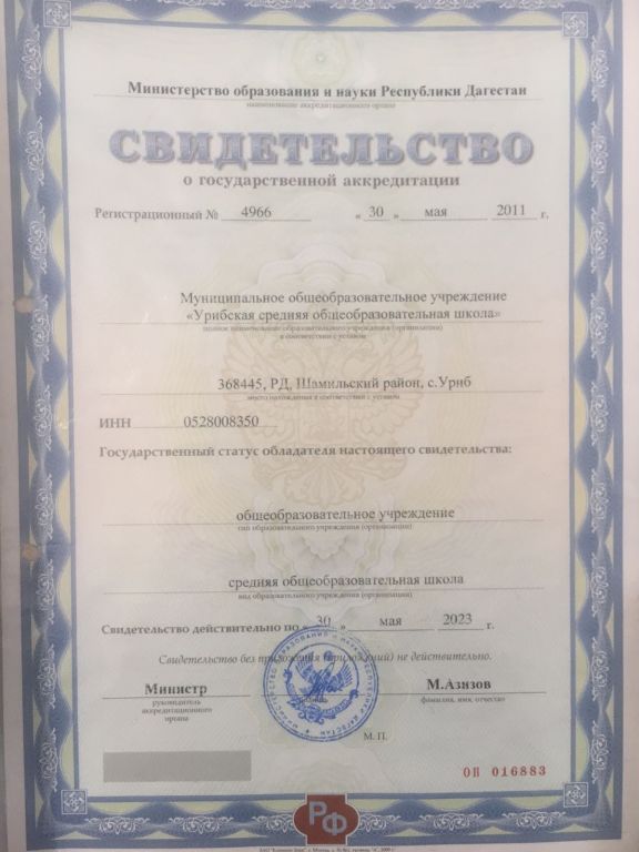 | Адрес местонахождения образовательной организации* | 364580, Республика Дагестан, Шамильский район, село Уриб |